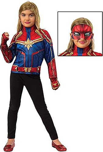 Child’s Captain Marvel dress up set features long sleeve top and fingerless gloves With non-shedding glitter accents; eye-mask with iridescent mesh included; child wears with own pants or skirt and shoes