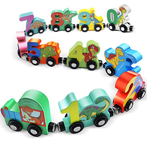 【Play 2023 New Train Sets】Combining two favorites among kids: dinosaurs and trains. Our wooden train sets include an engine and 10 dinosaur train cars, which are double-sided printed with dinosaur design, one side with numbers 0-9 extra. A fun and entertaining way to develop motor skills, foster imagination and creativity of your little train or dinosaur lover.